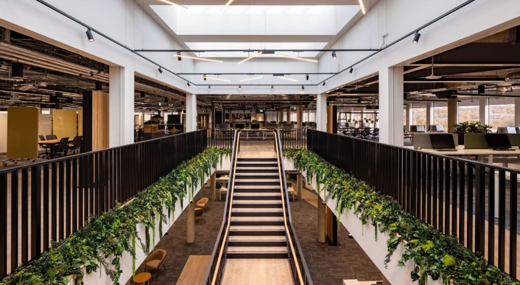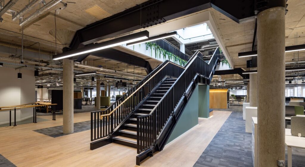 Details: Our feature staircase took centre stage over these two floors of the full refurbishment of Lloyds Banking Group’s Grade II-listed Halifax Trinity Road building, a 317,000 sq. ft office in West Yorkshire.